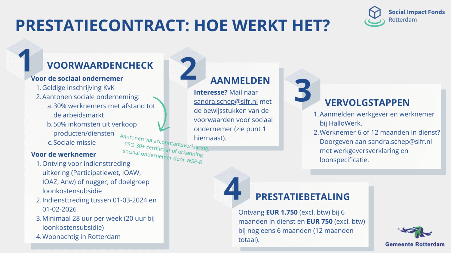 In 2021 zijn we gestart met de eerste fase. Het prestatiecontract is voornamelijk in het leven geroepen om sociale ondernemers te compenseren voor de extra begeleiding die nodig is om mensen met afstand tot de arbeidsmarkt duurzaam aan het werk te helpen. Wel is het van belang dat de onderneming voldoet aan de voorwaarden en definitie ‘sociale ondernemer’ die de Gemeente Rotterdam hanteert. De werknemer moet minimaal 6 maanden werkzaam zijn bij de onderneming voordat de ondernemer recht heeft of de compensatie.